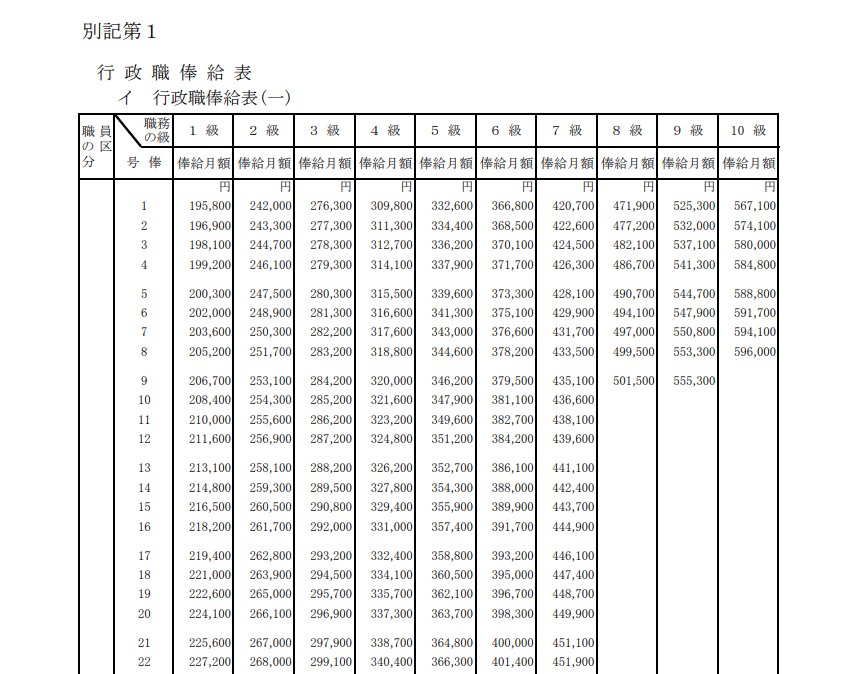公務員は職種ごとに「給料表(俸給表)」というものが定められています。